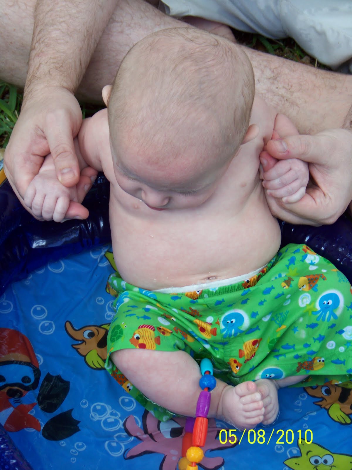 Yesterday we blew up Gavin's pool, put him in his swimming gear, and enjoyed his first time in his pool. The water was cold not warm like he is use to in his baths so he wasn't too happy in the beginning. He started to enjoy it more when he got use to the water. The pictures are in backward order. Before we took him outside we were playing with him on the couch. Got some cute pics with his daddy.