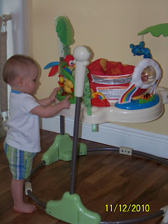 Gavin said his first phrases yesterday! I was passing him my cell saying "here ya go" and "Thank you" when he passed it back. Then out of the blue he passed me a bottle lid & said "Here ya go" and "Thank you" plain as day. Ben looked at me and asked did he just say that? He kept saying it over and over....even my mom got to hear him say it over the phone. It was awesome! He also says Daddy and Mumumum. He is growing up so fast! He isn't walking on his own yet but he is getting there and will be doing it in no time I bet! He crawls all over the house! He loves going full speed into our bedroom straight through to the bathroom and pulling up on all the handles on the cabinets. He loves opening and closing doors and he rather feed himself than have mommy or daddy feed it to him. Its so cute when he wants to come and sit beside me on the couch....he crosses his legs and leans back to watch some of his shows.....melts my heart when he wants some cuddle time with me. He is something else!